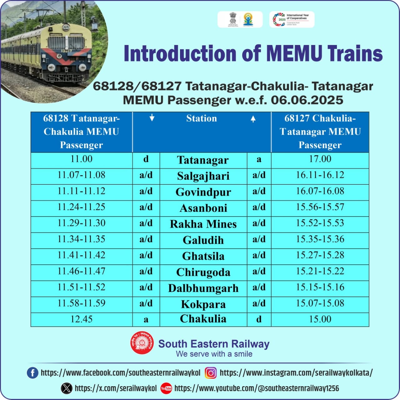 टाटानगर रेलवे स्टेशन से चाकुलिया और चाईबासा के लिए दो नई ट्रेनों का परिचालन शुरू होगा। दक्षिण पूर्व रेलवे ने इसे लेकर अधिसूचना जारी कर दी है। 06 जून 2025 से दोनों नई ट्रेन का परिचालन शुरू होगा।